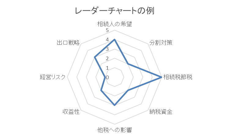 「分割対策」「納税対策」「節税対策」「相続人の希望」「収益性」「リスク」「出口戦略」といったポイントでレーダーチャートを作成すると、その対策による全体的なバランスが可視化でき、関係者との認識を深めることができるのではないでしょうか。